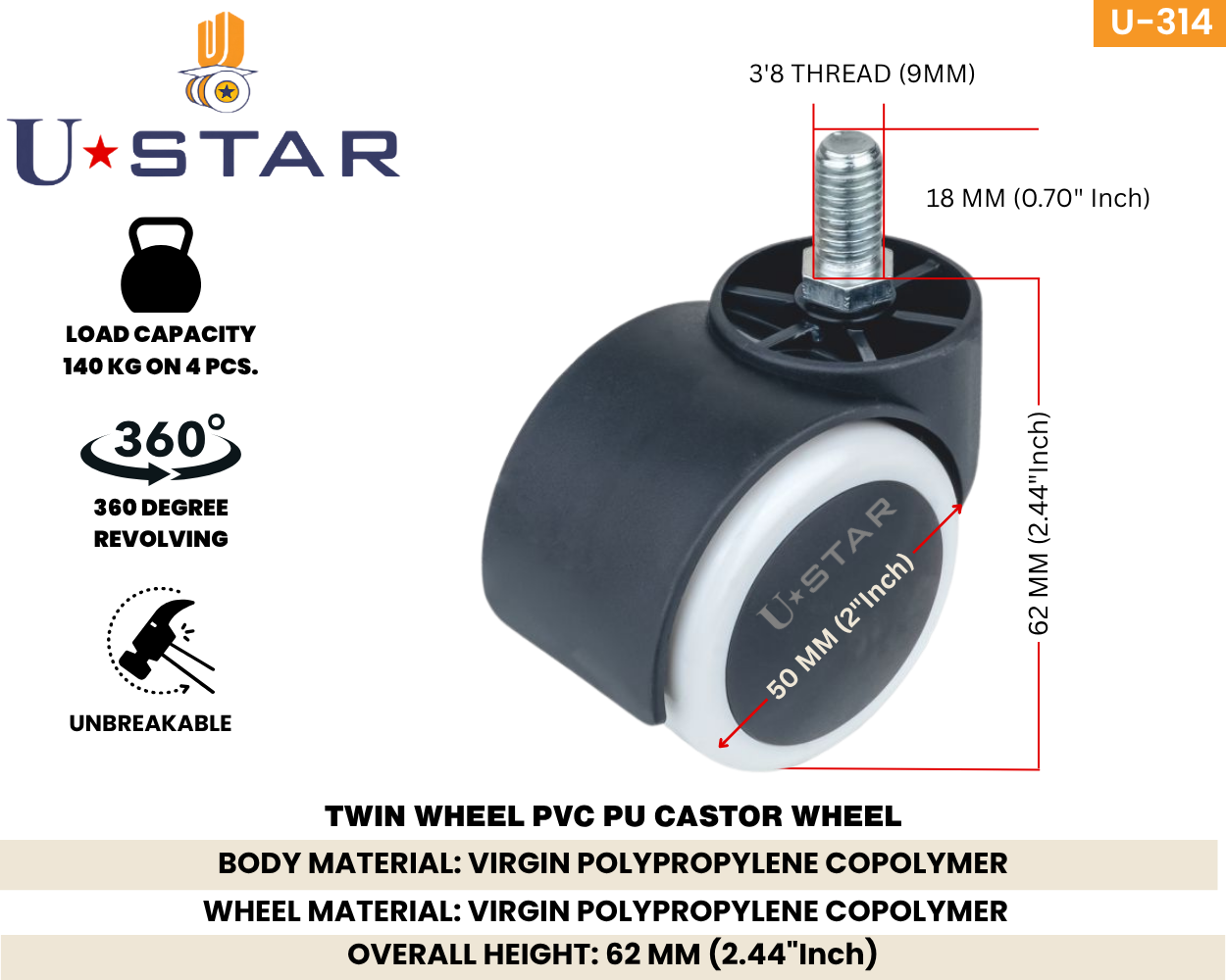 Package Contents: You will get 5 pcs of 2 inches 50mm diameter office chair caster wheels with 3'8 thread gray and black pvc pu coated