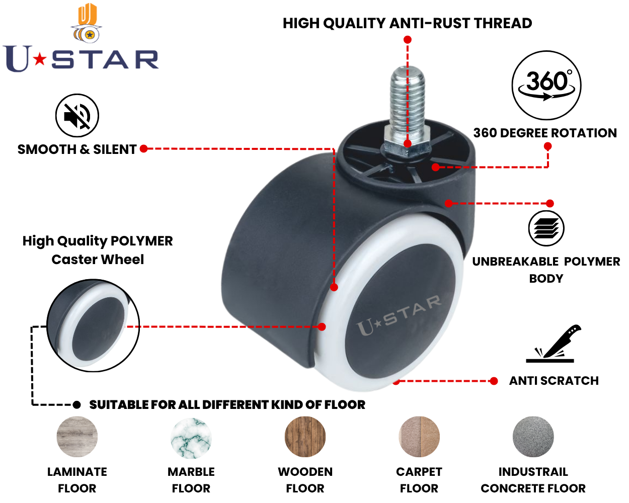Upgrade Your Chair: Replace worn-out chair wheels with USTAR Heavy Duty thread Type Office Chair unbreakable wheels.